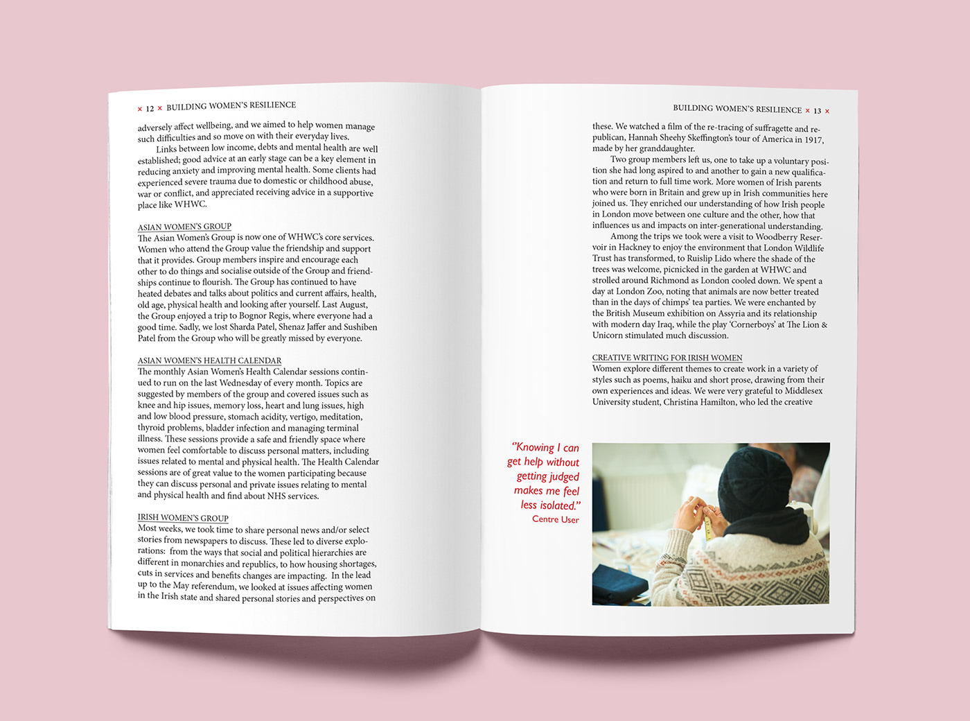 For this collaboration with a photographer Jessica Bernard I was approached to design the Annual Report for West Hampstead Women’s Centre, a charity that aims to empower women emotionally, socially, and economically and encourage them to fulfil their potential.